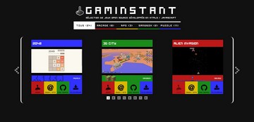 Gaminstant est un mini site listant des jeux vidéo open source réalisés intégralement en HTML5/Javascript, proposant une courte description de chacun d'entre eux au survol du curseur, un lien pour y jouer directement depuis Gaminstant et/ou depuis le site d'origine ainsi que des liens permettant d'accéder au code source sur GitHub ou de télécharger directement les archives contenant les fichiers sources de ceux ci.